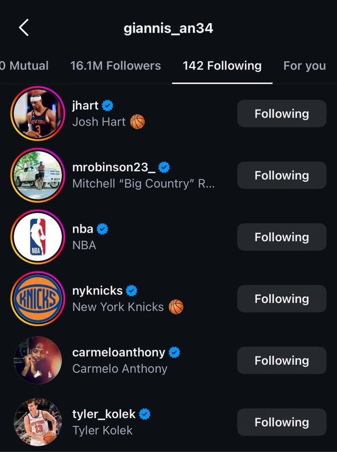 直播吧7月18日讯 今日尼克斯媒体June发文爆料字母哥在社交媒体上新关注了几名尼克斯的球员。