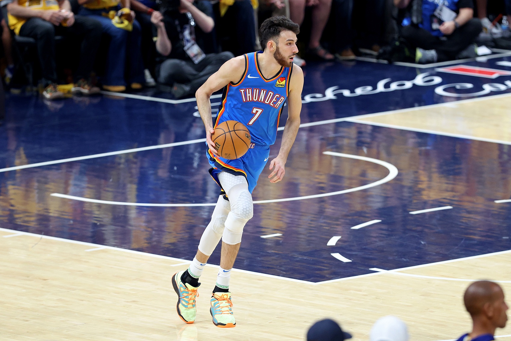 6月24日讯 昨日,雷霆抢七103-91胜步行者,成功夺冠。此役,切特-霍姆格伦首发出战。